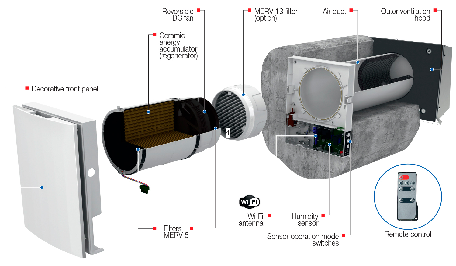 | One of the best heat recovery efficiency on the market due to innovative hexagonal structure of the heat exchanger cells. | The specially designed front panel can be closed manually to ensure 100% air tightness and protection against wind. | Easy maintenance. The indoor unit is openedby pressing the latches | Integrated air shutters prevent air back drafting. |